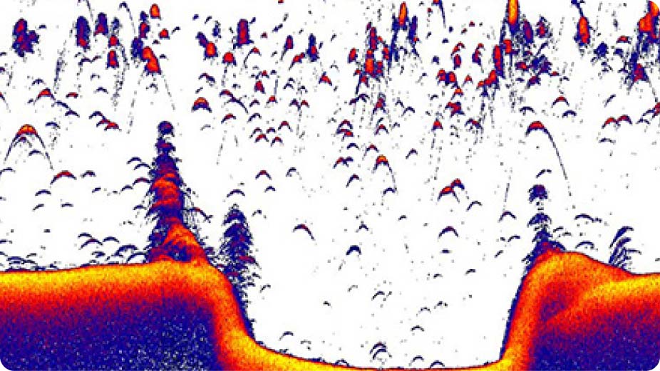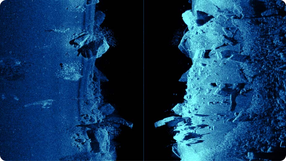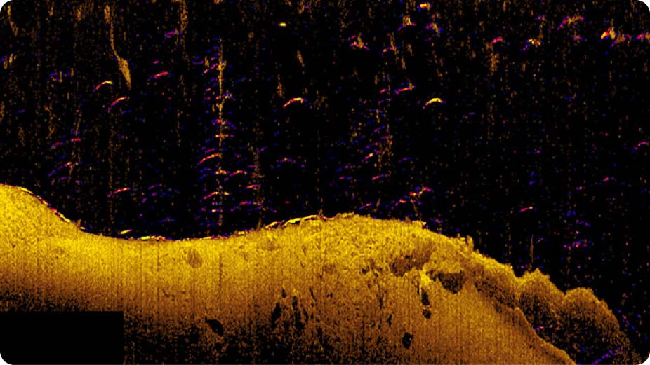 Idéal pour la recherche dans de grandes zones abritant des poissons, SideScan offre des vues jusqu'à 600 pieds de chaque côté du bateau, ce qui vous permet de couvrir une plus grande surface en un temps plus court et de visualiser les zones trop peu profondes pour votre bateau, par exemple près de la rive.