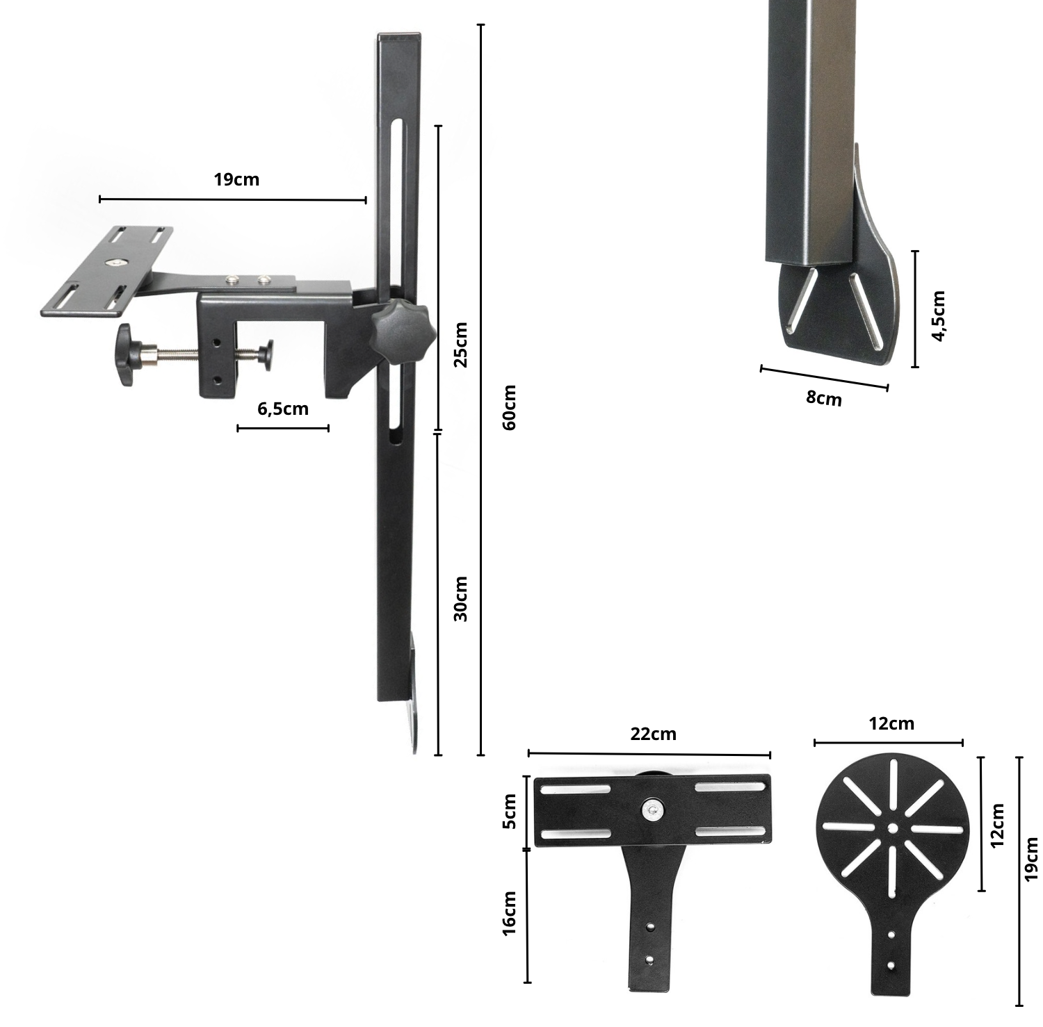 Ce support est fabriqué en Angleterre. Sa fabrication en aluminium lui permet d’être à la fois très léger et robuste. Les filetages sont en acier inoxydable. Sa finition en peinture époxy noire le rend très élégant et lui assure une durée de vie de plusieurs dizaines d’années.